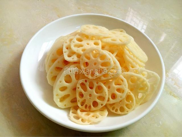 1.新鲜莲藕去皮切成薄片。