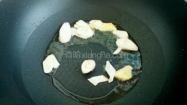 4.锅中倒适量油烧至五成热,放入葱、姜、蒜炒出香味。