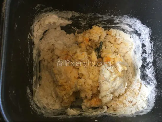 3.所有的食材加入面包机,盐和砂糖对角放,酵母挖个坑放中间,揉面3个15分钟