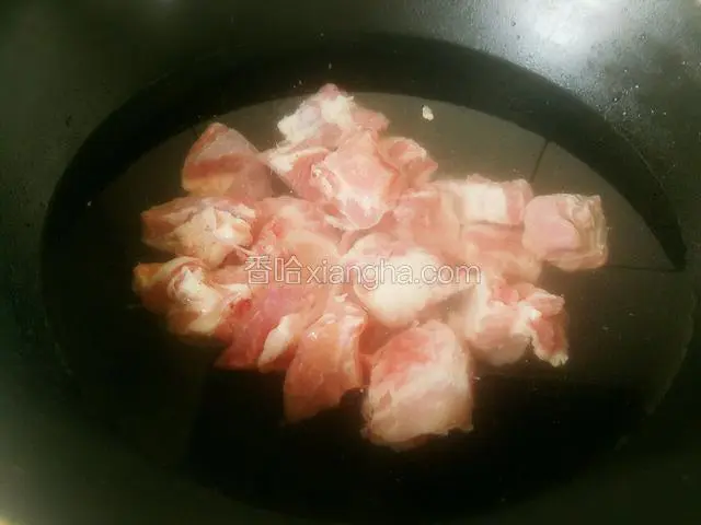 4.锅中添凉水,放入排骨,在放点儿料酒,开大火,水煮沸后将排骨煮两分钟。