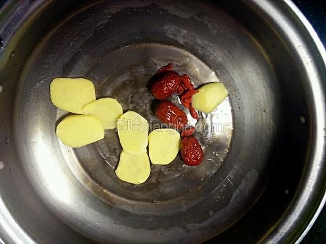 2.把生姜洗干净切片,枸杞红枣洗干净放碗里