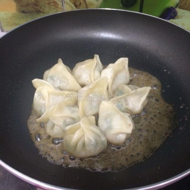 4.煎到底面金黄,倒入约半厘米高的水,烧开后盖上锅盖焖煮。
