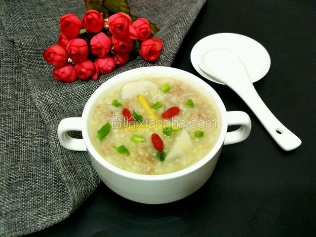 6.粥煮好打开盖,加入瘦肉拌均匀,粥重新滚5-6分钟即可出锅