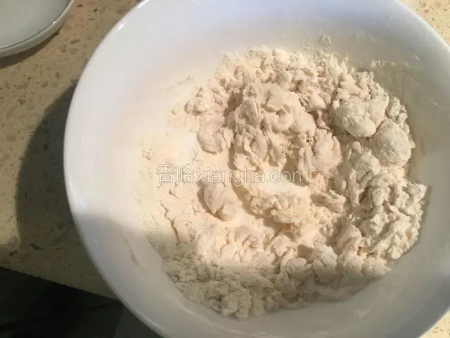 5.面放入 碗里,缓缓倒入清水,一边倒一边搅拌,直至面粉成为面疙瘩。