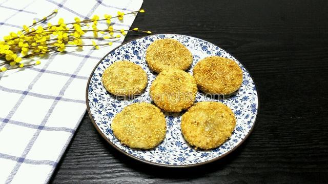 5.放入芝麻里滚一圈,再拿起来在手心按压成饼。