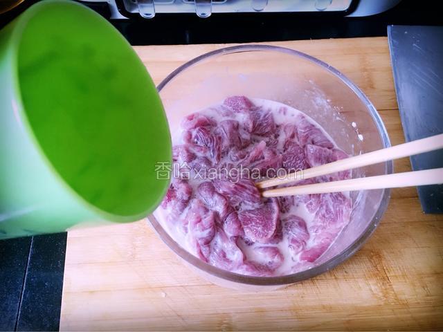 3.倒入大碗内,加入盐,料酒,鸡蛋清,淀粉,胡椒粉及少量的清水,搅拌均匀,腌制20分钟