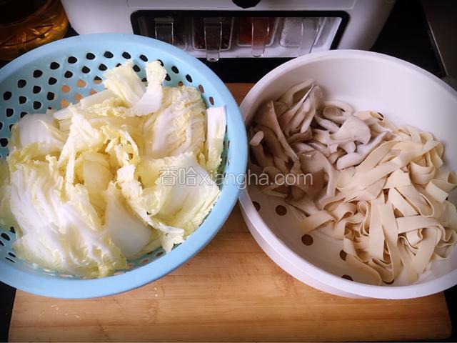 4.秀珍菇,娃娃菜撕成小片洗净,千张切成丝,然后沥干水份