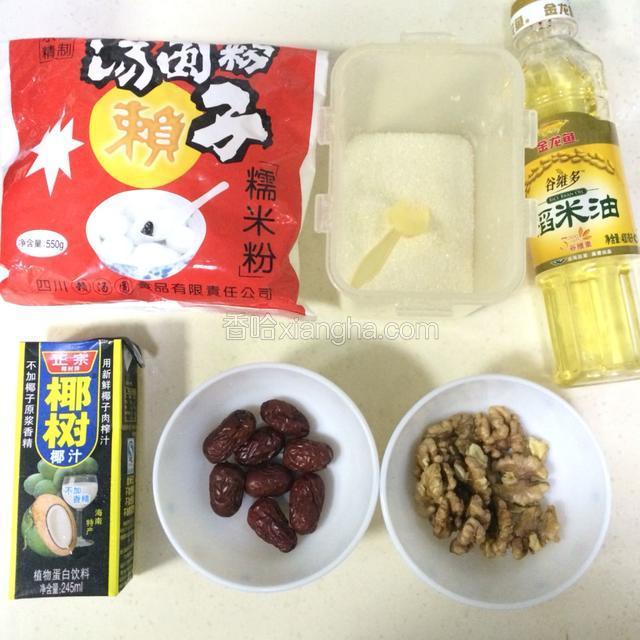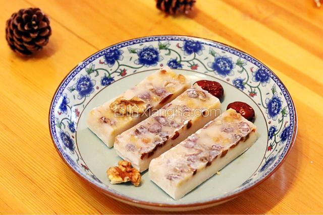 3.红枣洗净擦干,核桃仁去皮,用刀把红枣和核桃仁切碎。
