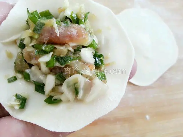 4.姜末、适量盐、白胡椒粉、料酒、花椒水放入肉中,搅拌均匀,再将韭菜和圆白菜切成小段放入(圆白菜先切细丝、再切小段)