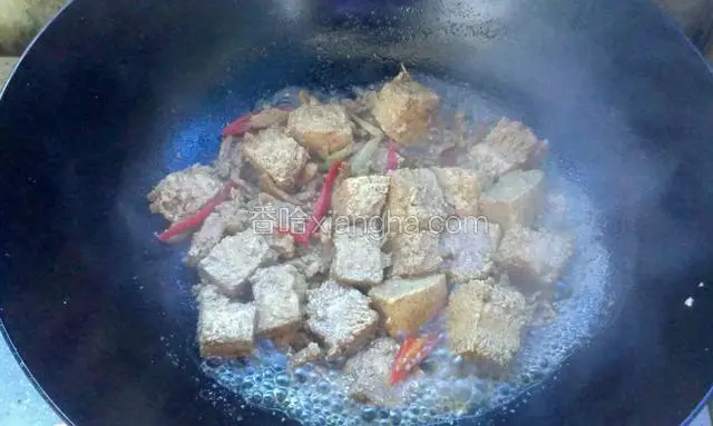 4.肉变色后到点生抽和老抽,放盐,然后放豆腐翻炒均匀