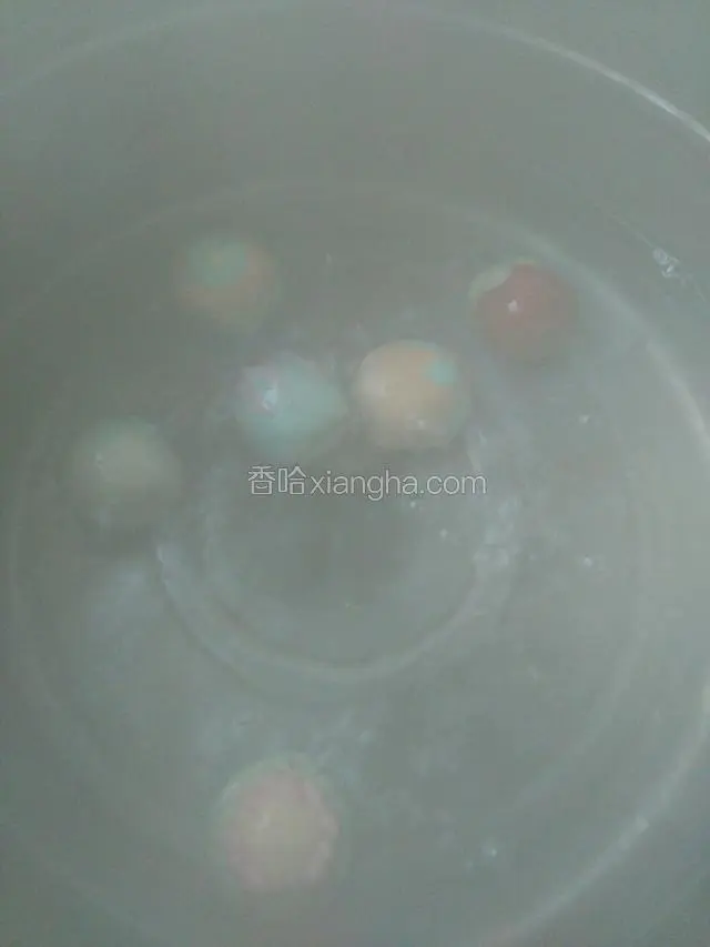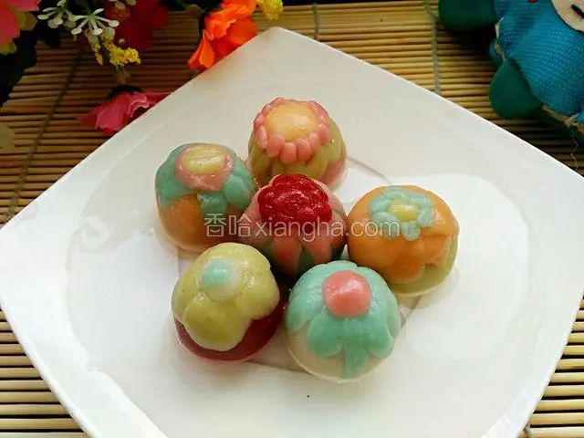 5.每个颜色取一半揉圆按扁包入馅料。馅料随自己喜欢,我放了绿豆沙馅。