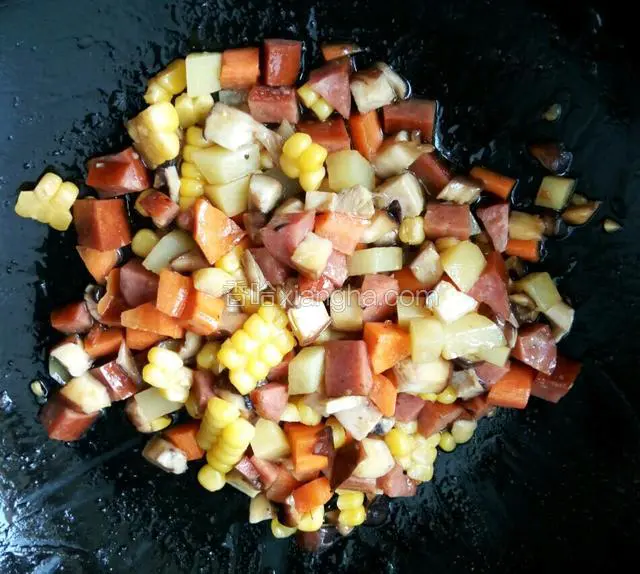 5.再加入胡萝卜,土豆,玉米粒煸炒
