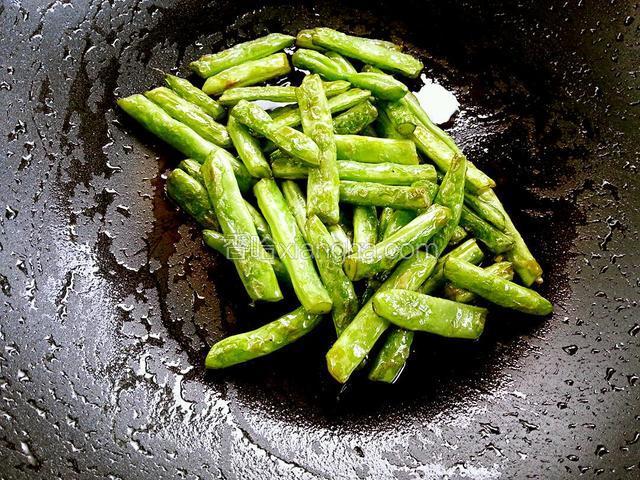 5.放入豆角煸炒,中小火,慢慢炒,勤翻动