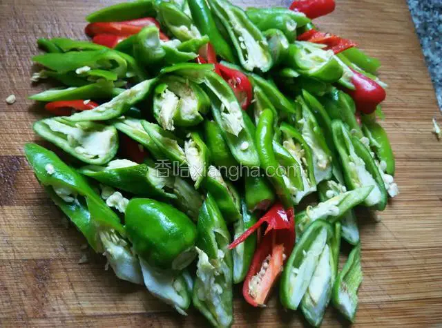 4.切好的辣椒冲洗一下,洗掉辣椒籽,然后倒出滴干水