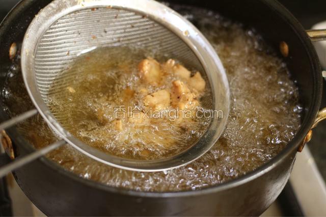 3.油炸锅中加半锅油,能没过鸡块。中火加热至5成热(可以先扔一块鸡块进去,出现细密小泡就行),放入鸡块中小火炸熟炸透,呈金黄色,捞出。