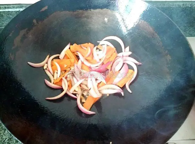 6.倒入焯七成熟的胡萝卜片混炒一会。