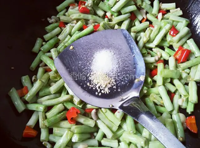 6.炒到红椒断生,豆角也熟了,最后调入扣和鸡精翻炒匀出锅