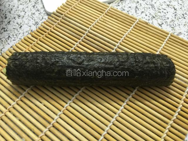 4.寿司帘上铺一张海苔光面在下,涩面朝上