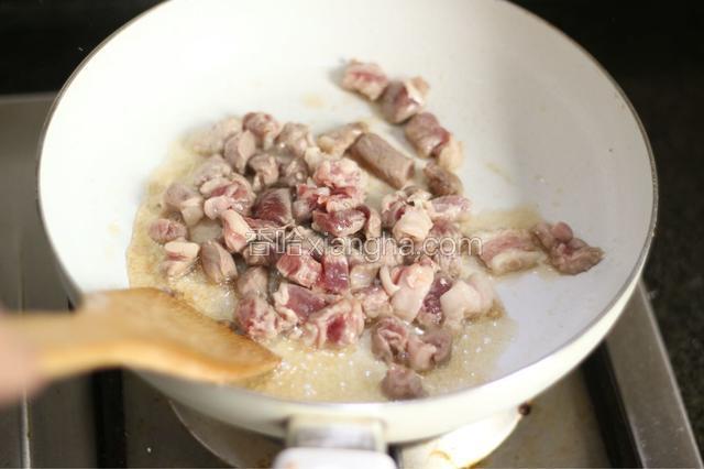 3.羊肉丁下锅大火翻炒至羊肉表面收紧,颜色变金黄。