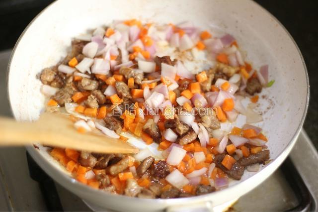 5.下洋葱胡萝卜翻炒一分钟至洋葱出香味。