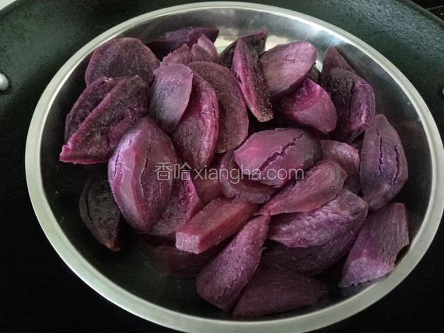 1.紫薯去皮、洗净、切块,隔水蒸熟。