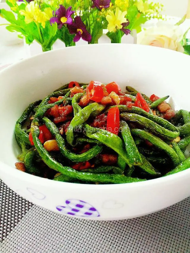 6.放入炸好的豆角,加盐调味炒匀即可