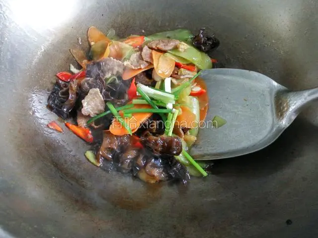 2.莴笋,胡萝卜,红辣椒切片,木耳大朵改刀,葱切段
