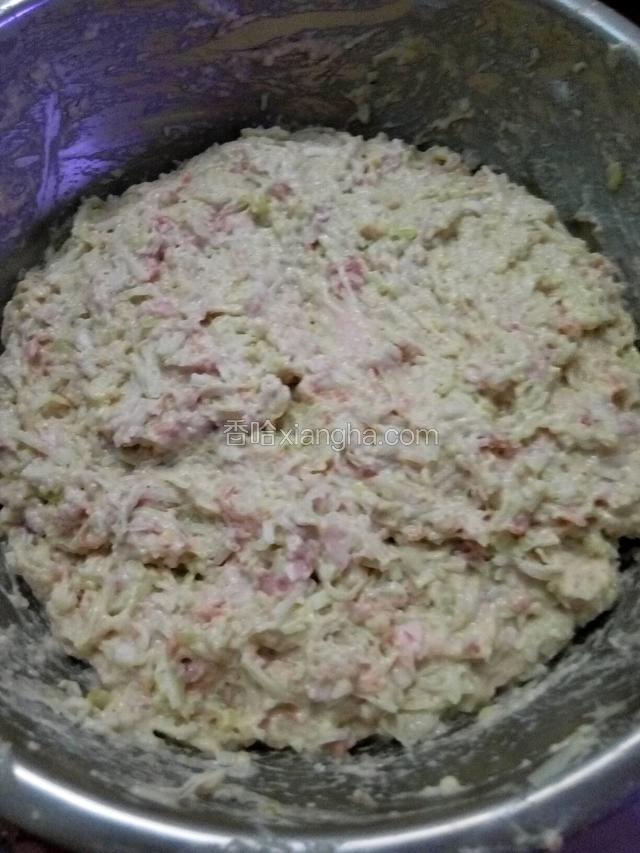 5.把萝卜丝放入肉馅里,放入葱姜末,五香粉,盐搅拌均匀