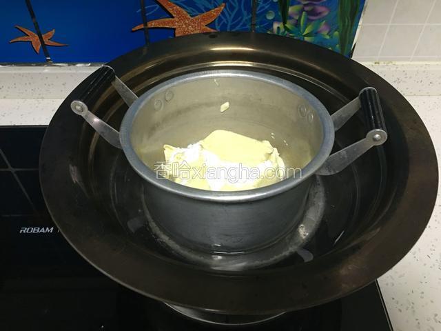 4.奶油奶酪加糖粉隔水融化用打蛋器搅拌均匀