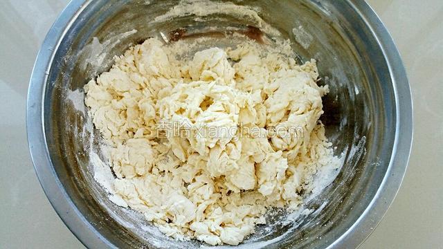 2.划圈倒入热水,用筷子搅拌成棉絮状。