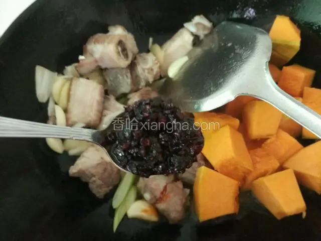 5.再放入南瓜和老干妈豆鼓翻炒一分钟;