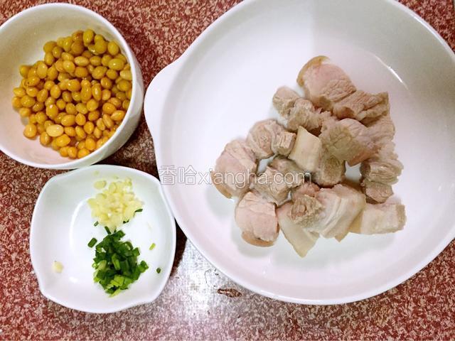 1.黄豆提前用水浸泡至软,五花肉切小块备用