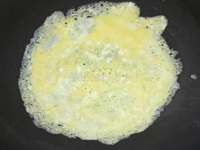 3.锅烧热,导入少许的葵花油,将鸡蛋液摊成蛋皮。