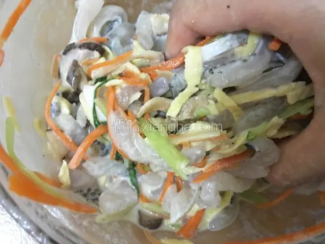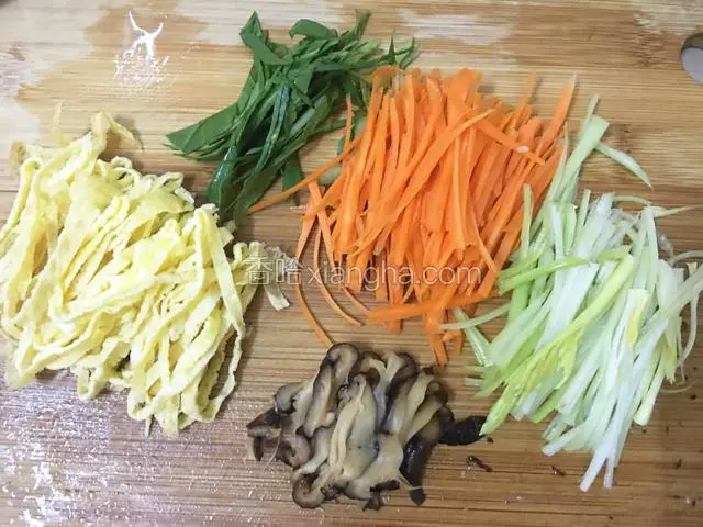 5.分别将胡萝卜,油菜叶、蛋皮、香菇、还有嫩芹菜切成细丝。