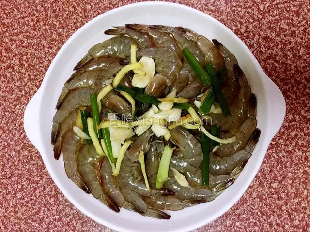 3.把虾分别摆放在盘中,上面放上葱段、姜丝、蒜头