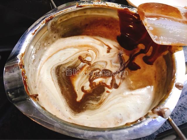 6.煮一锅45度左右的热水,巧克力隔热水搅拌成液态。