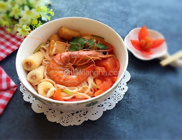 5.待西红柿煮烂后,倒入丸子和大虾,煮五分钟