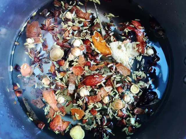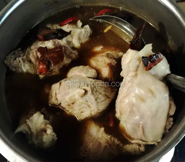 6.将过水的牛肉放入卤水中,小火煮一个半小时,也可以加入其它材料,如鸡爪藕,鸡蛋等一起卤制。