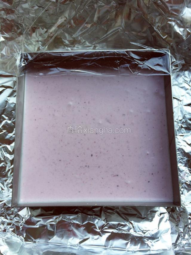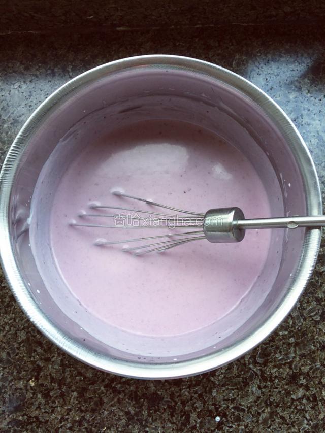 6.把4的蓝莓液倒入打好的淡奶油中切拌均匀,慕斯糊就彻底做好了
