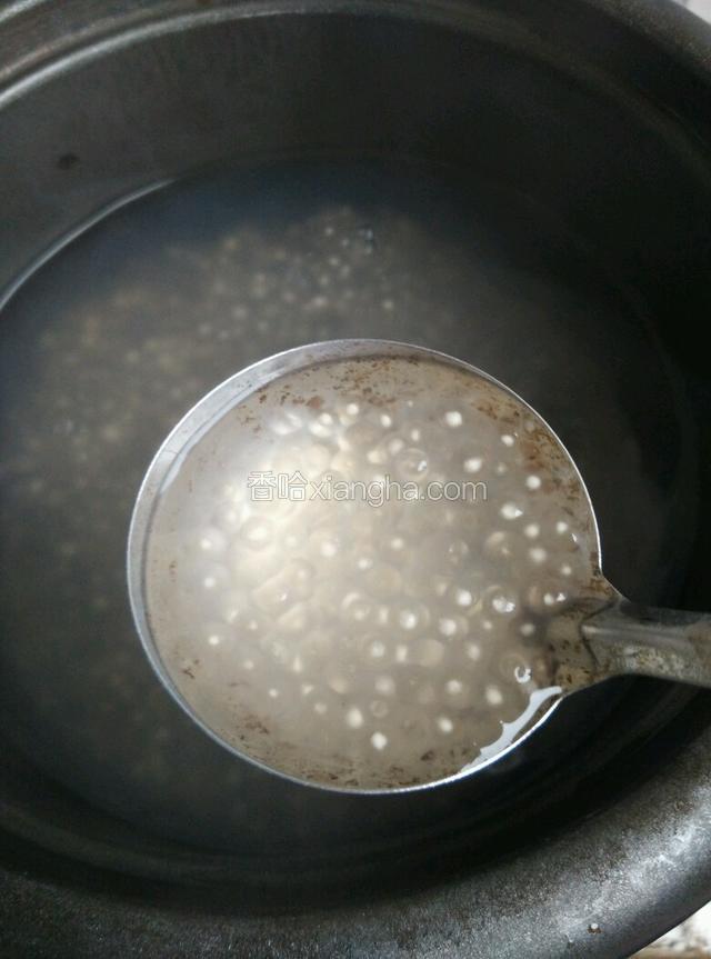 3.大火煮10分钟,煮至西米呈半透明状,改小火焖5分钟,让西米成透明颜色