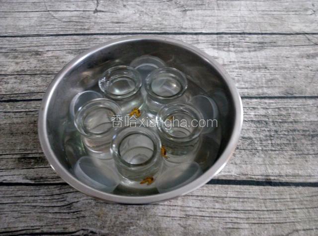 4.我们在等待牛奶混合物晾凉的同时,把布丁瓶跟瓶盖用开水烫一下,高温消毒。