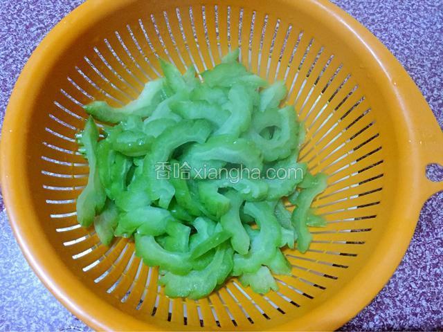 1.准备好食材:猪肉洗净切成薄片加入适量的盐和鸡精、生抽、淀粉、玉米胚芽油抓匀腌制半小时,苦瓜去瓤洗净切成薄片,蒜切末备用