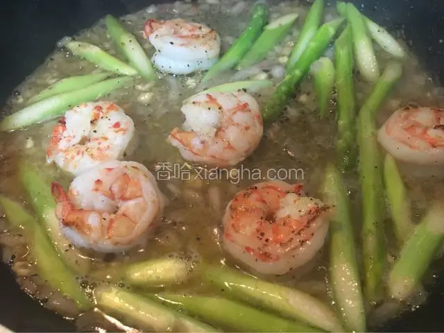 5.再放入芦笋炒香,加入少许高汤烧开;