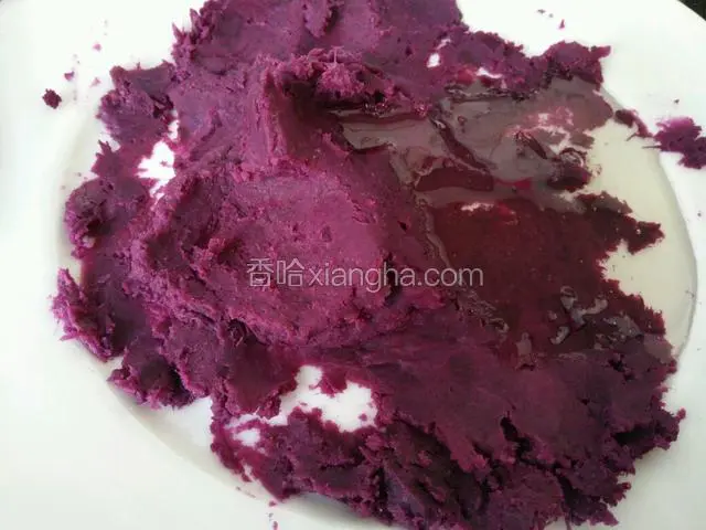 5.趁热将紫薯去皮,用勺子压成泥再与蜂蜜混合匀