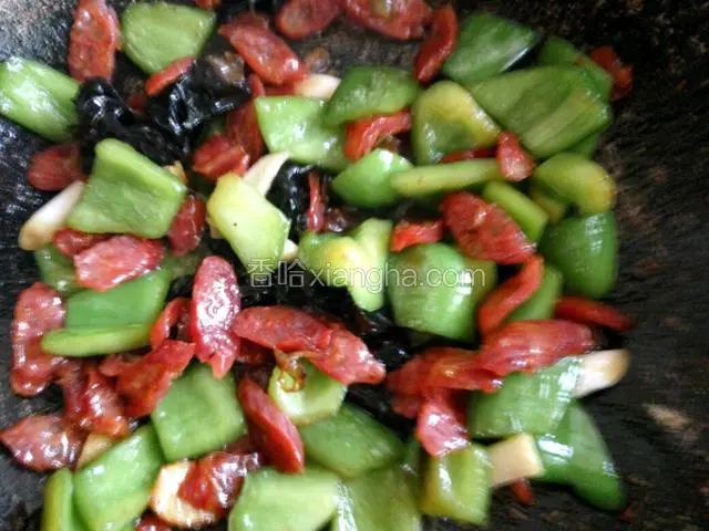2.腊肠切斜片 青椒洗净去籽切块 葱切段姜切片