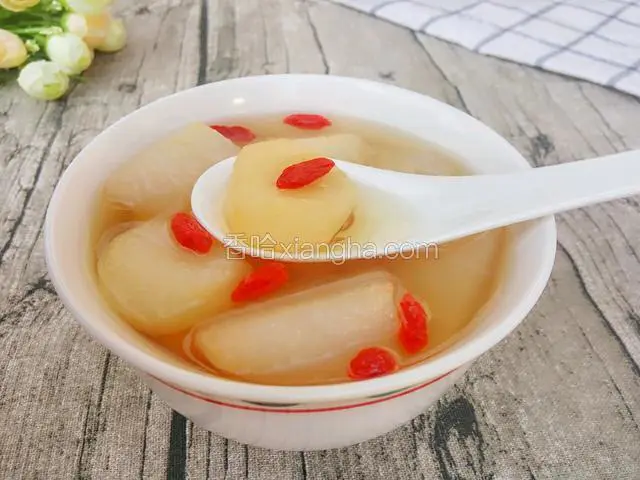 4.出锅,用洗净的枸杞子点缀一下。一碗爽口清脆的马蹄雪梨糖水就好了。天冷了,趁热喝一碗 真舒服
