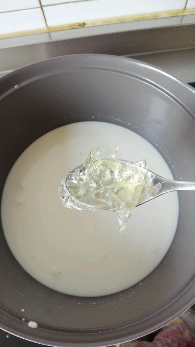 6.将牛奶加热到五十度左右。慢慢搅拌至融化。