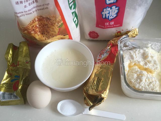 2.放除黄油外的所有材料,先放入液体材料,然后是盐和白糖,再次是高筋粉和酵母,高筋粉上挖个坑,把酵母埋起来。
