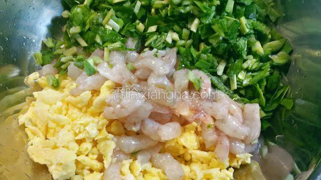 5.韭菜切碎,虾仁切半,鸡蛋弄碎凉透。