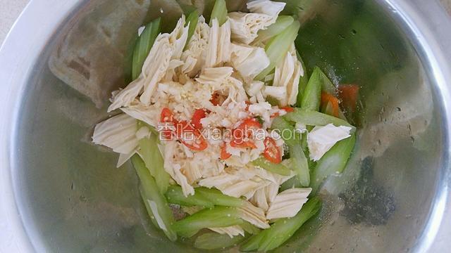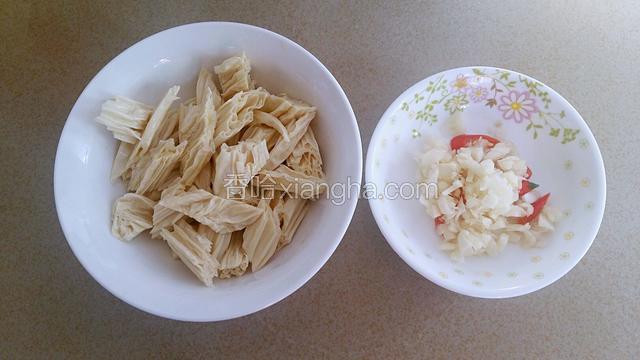2.泡发后的腐竹,切段备用,小米椒大蒜切末